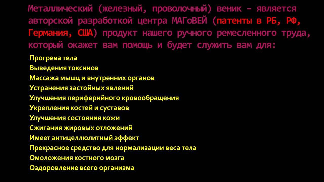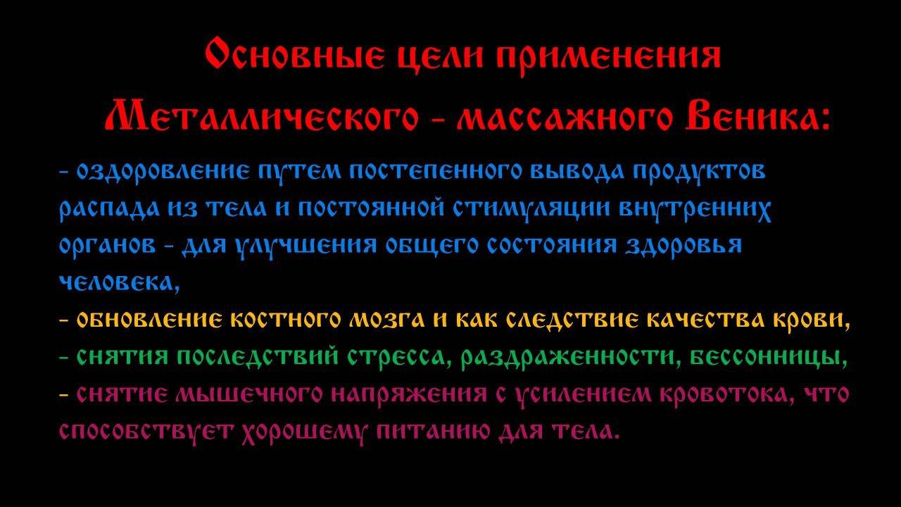 Применяется, как и все массажные металлические веники и дополнительно при помощи этого веника ладят истоты (чакры), ядра сознания (котлы силы), очищают от эфирных паразитов биополе человека.